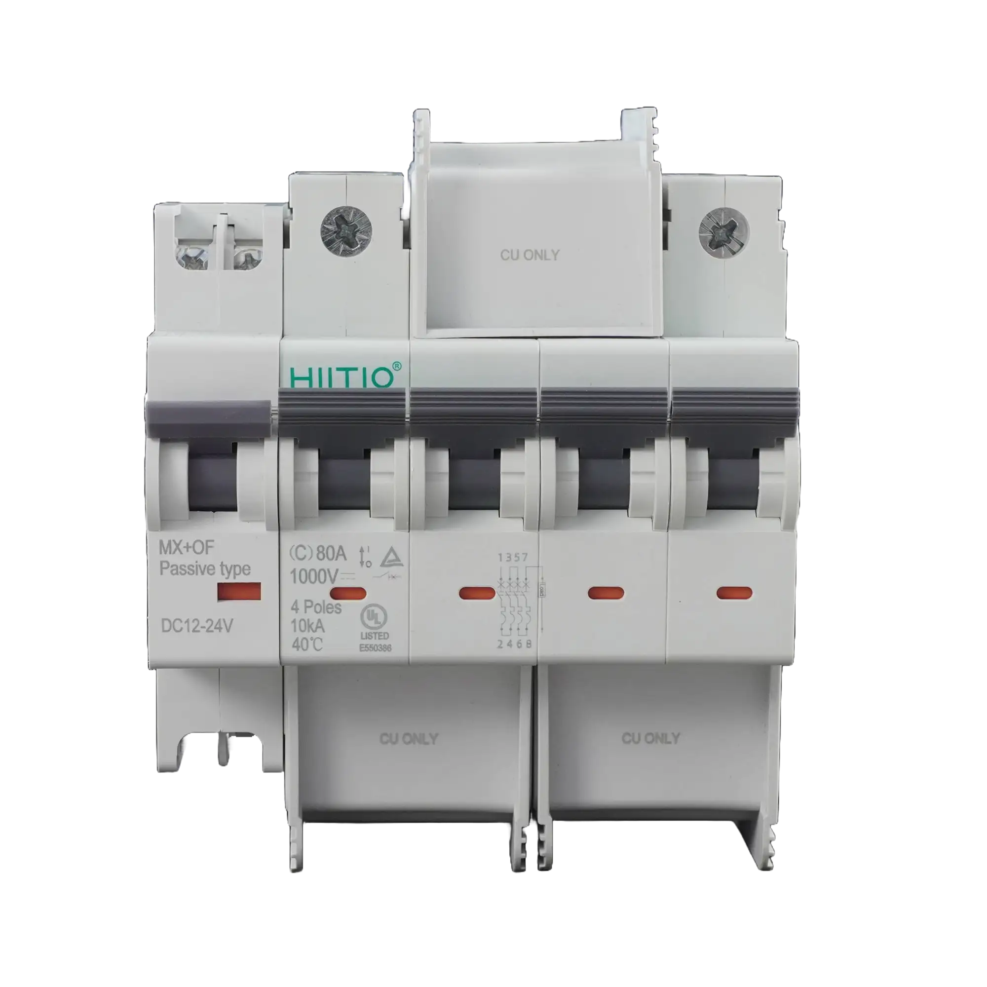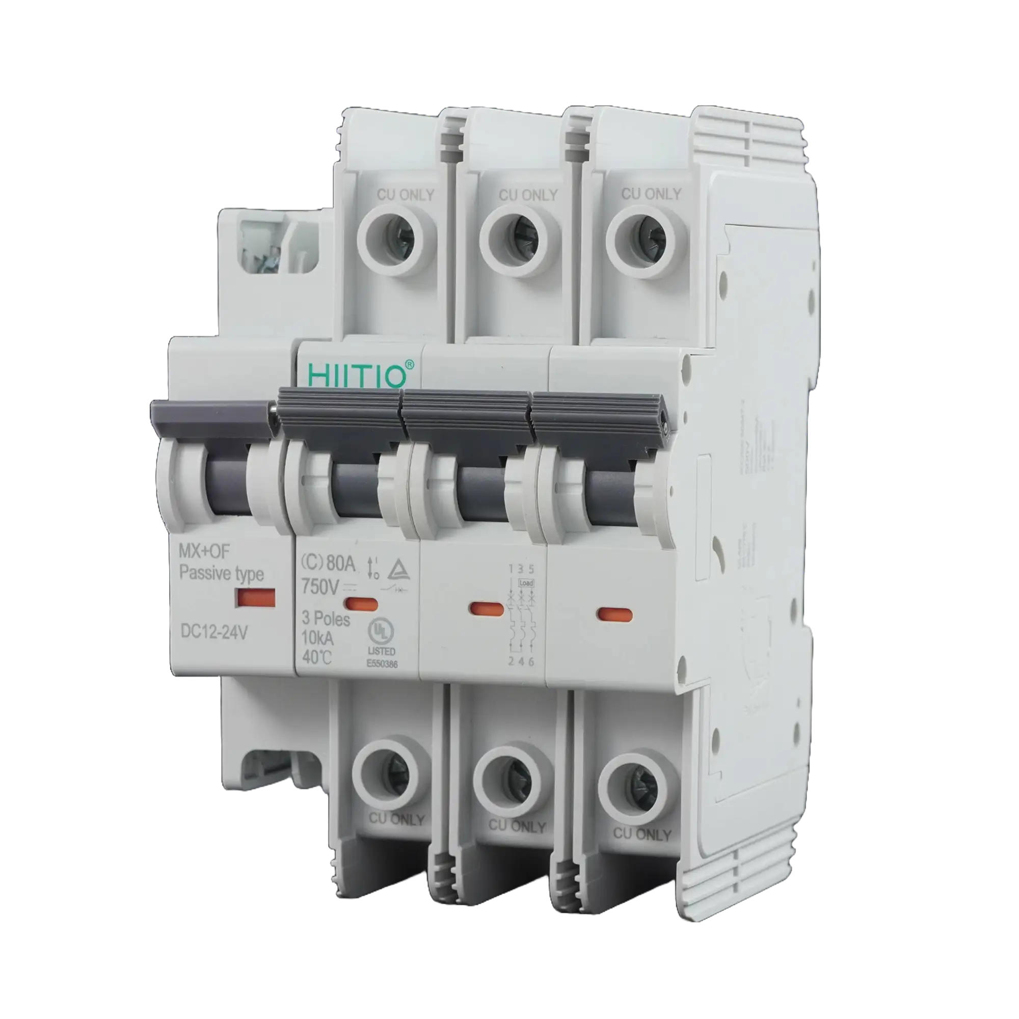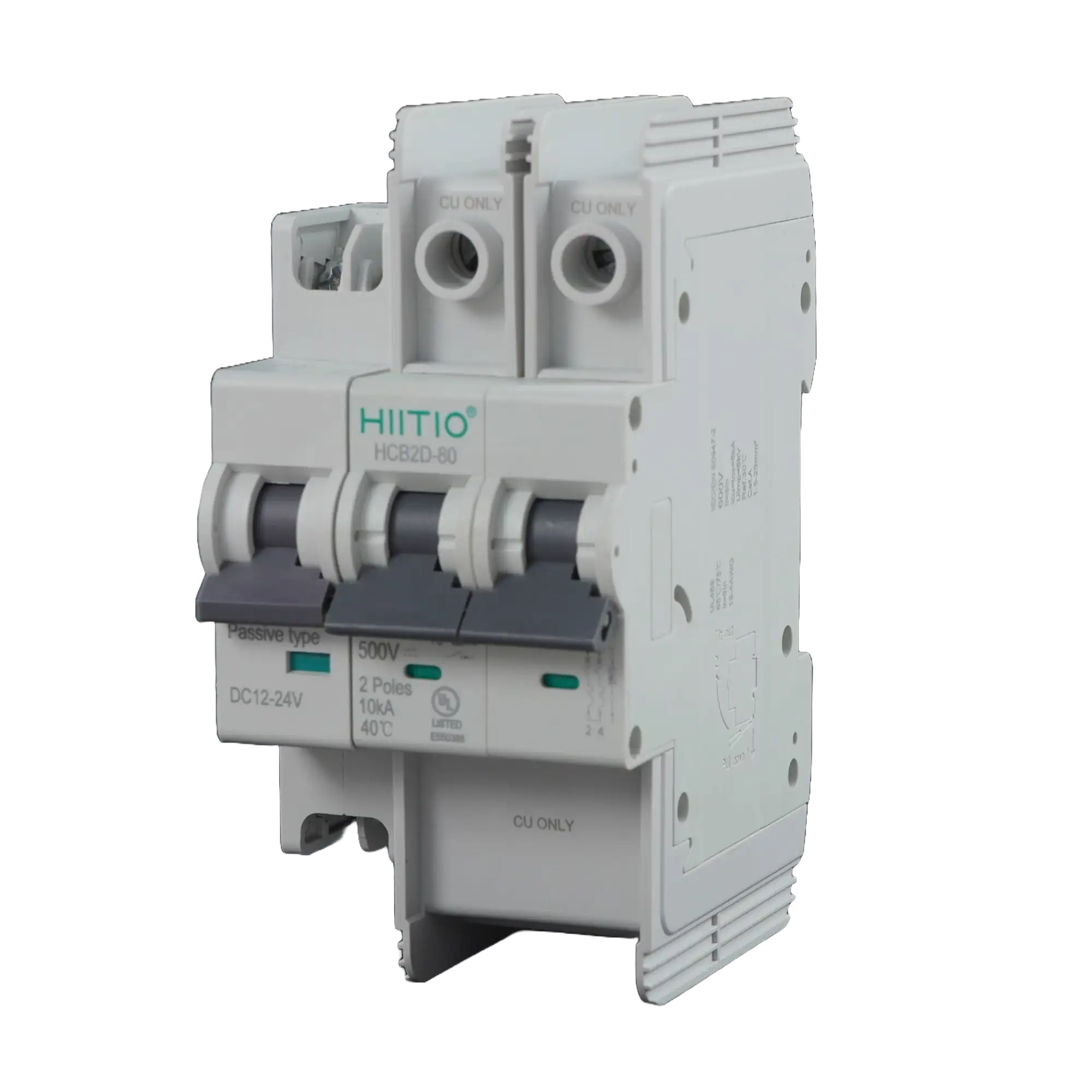The HCB2D-80 DC Miniature circuit breaker (hereinafter referred to as the “MCB”) is suitable for DC working environments. Its rated working voltage can reach up to DC 1000V, and it is used as overload protection and instantaneous protection in circuits with a rated current of up to 80A. The circuit breaker has overload and short-circuit protection functions, which can protect the lines and power equipment from damage. The product design complies with standards: IEC/EN 60947-2 and UL489.