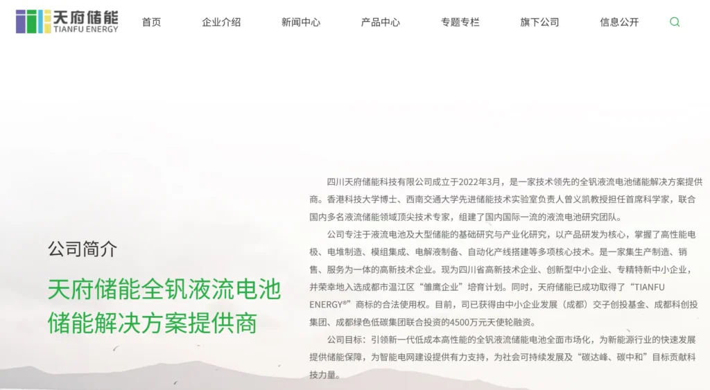 | 6 | Sichuan Tianfu Energy Storage | 2022 | Battery modules, packaged VRFB systems | 四川天府储能科技有限公司 |